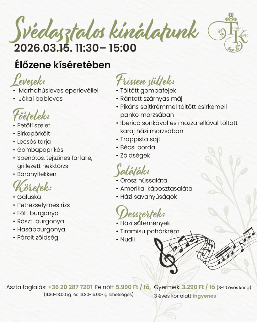Ételeinkben a klasszikus és innovatív megoldások találkoznak: a gazdag, fűszeres aromák harmonikusan egészítik ki a lágy, édeskés vagy éppen pikáns jegyeket. Konyhánk különös figyelmet fordít arra, hogy minden fogás egyedi és emlékezetes legyen, legyen szó könnyed, frissítő előételekről, laktató főételekről vagy elegáns desszertekről.